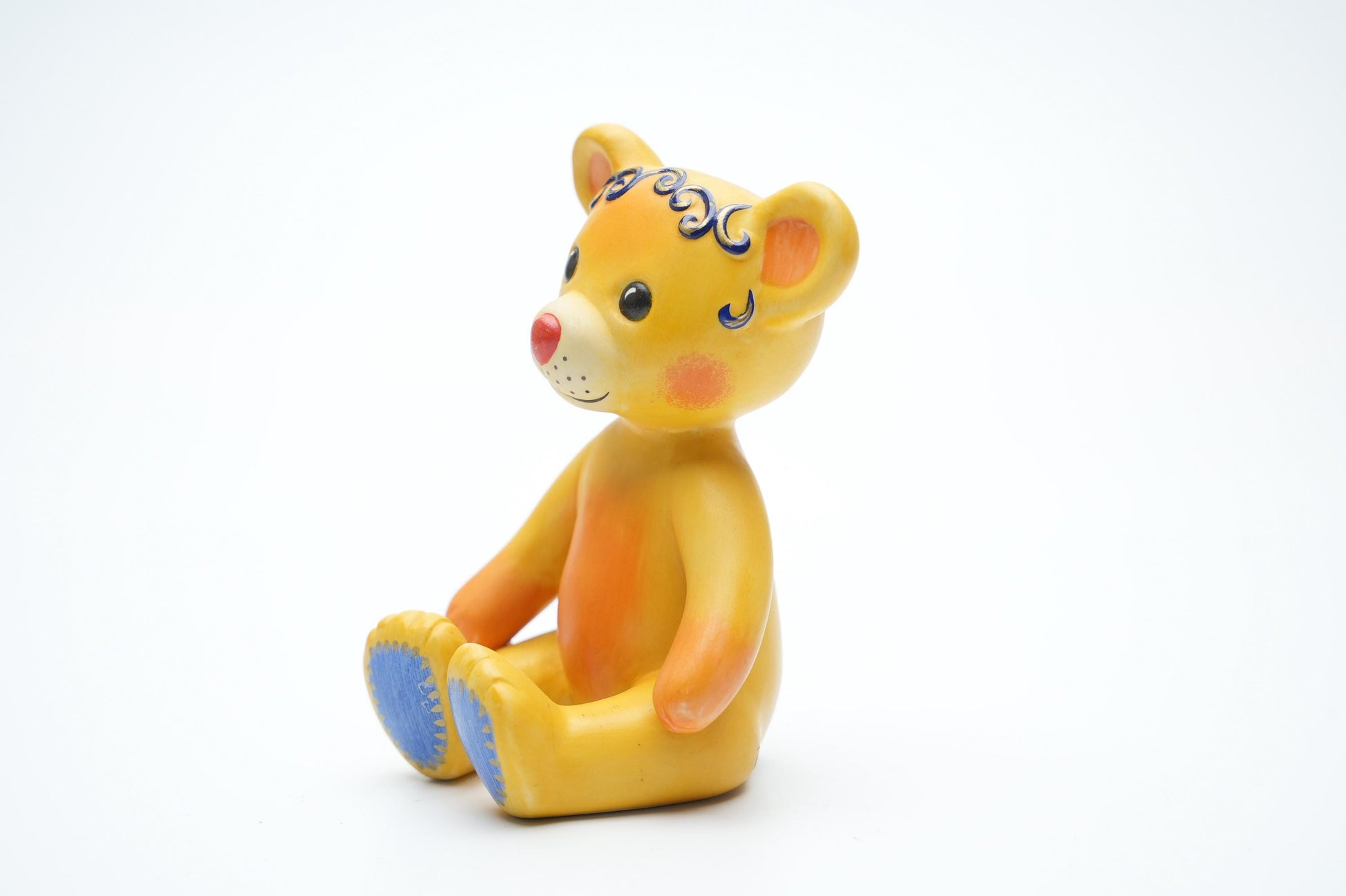 Breng een vleugje warmte en speelsheid in je interieur met dit charmante berenbeeldje "Carla", ontworpen door de geliefde kunstenares Rosina Wachtmeister. Het figuurtje is prachtig met de hand beschilderd in levendige geel- en oranjetinten, met schattige blauwe voetjes en speelse krulaccenten.