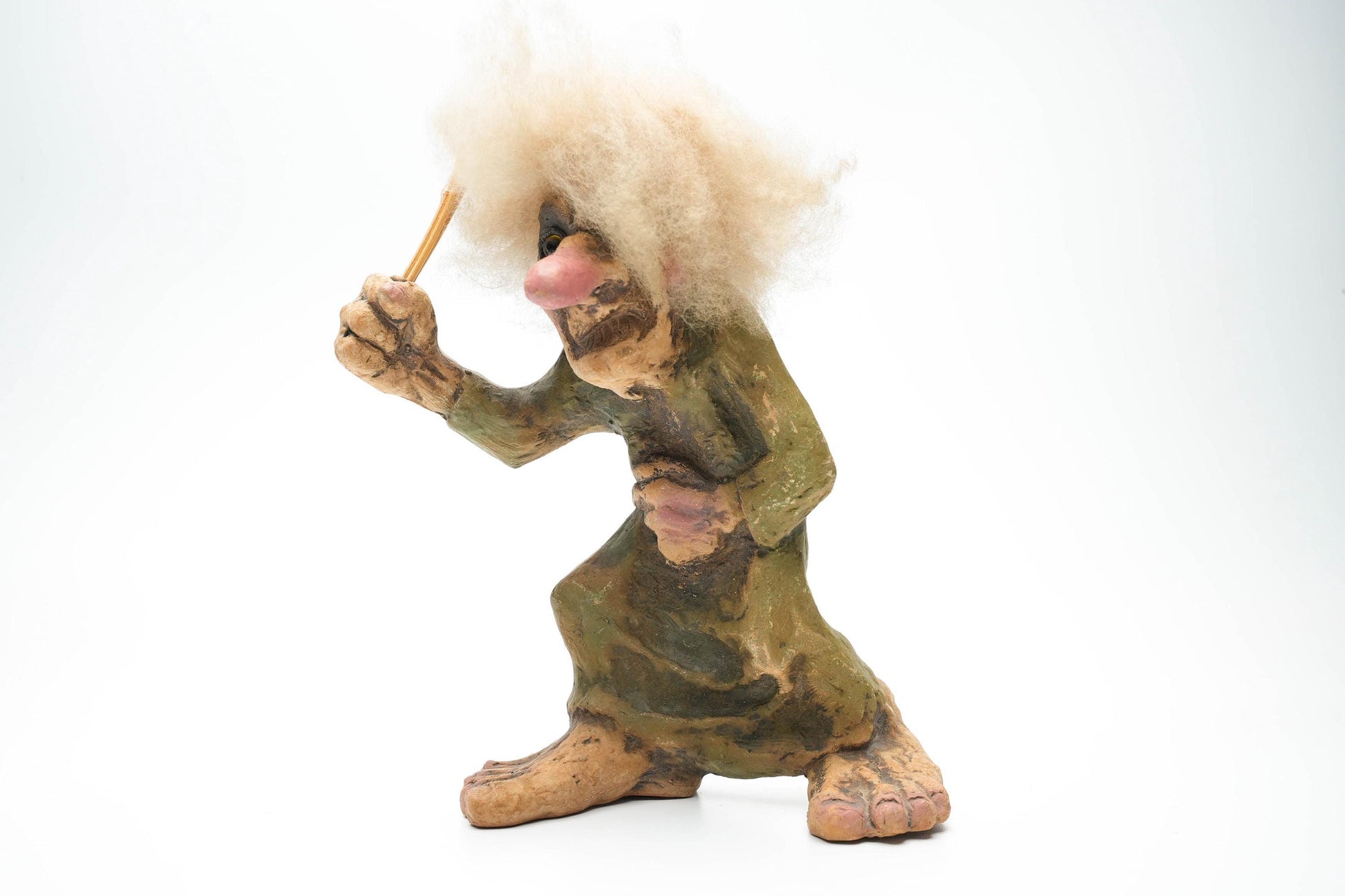 Ontdek de charme van de Grote Vintage Nyform Trol met Slingshot – een handgemaakt Noors troll beeldje dat elke ruimte tot leven brengt. Deze imposante trol van ongeveer 25 cm (circa 9.8 inch) hoog is niet alleen een prachtig voorbeeld van traditioneel vakmanschap, maar ook een echte conversatiestarter die de mystiek van de Noorse folklore naar je interieur brengt.