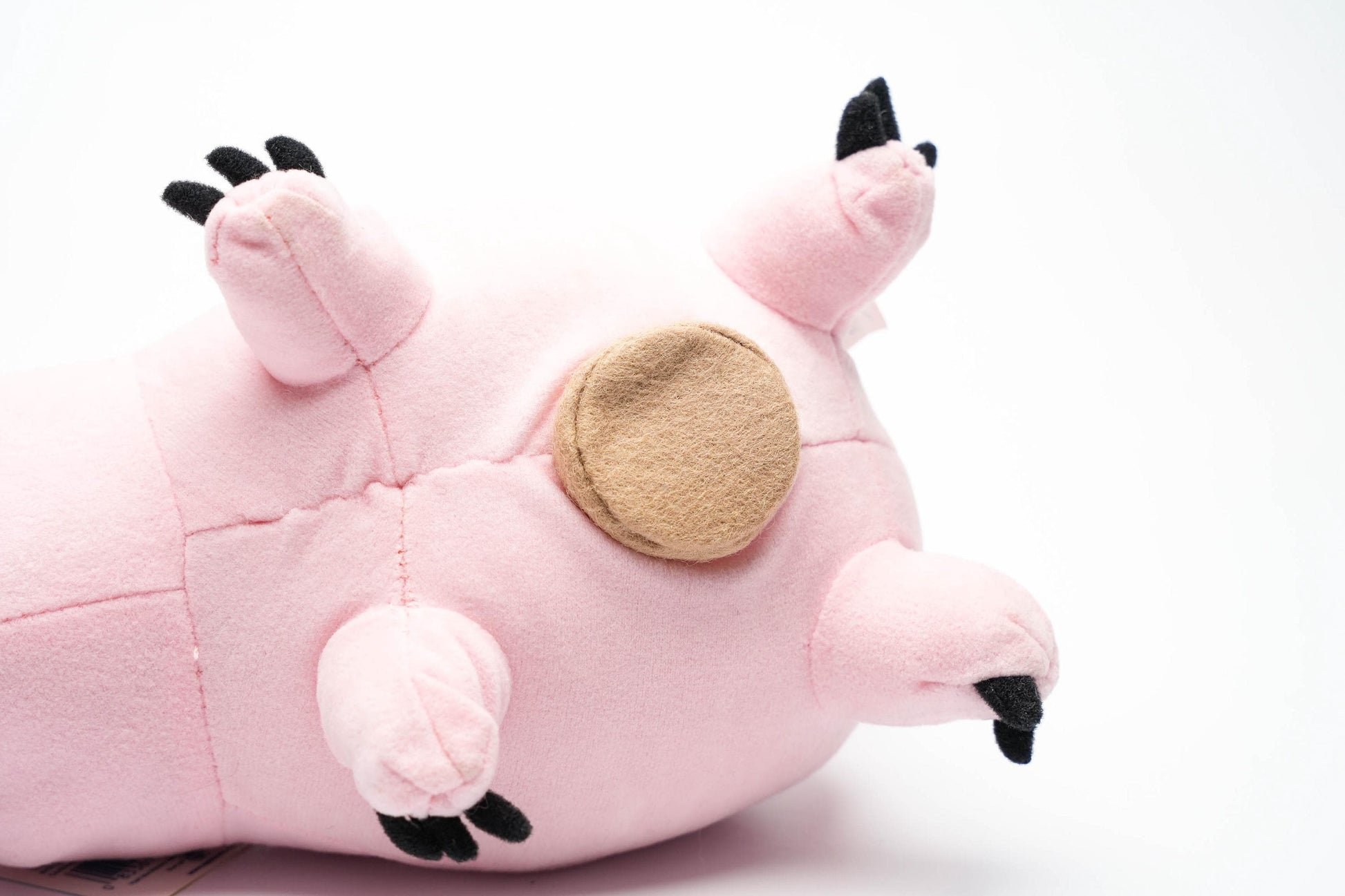 - Zachte pluche met stevige details, inclusief muntgleuf op de rug