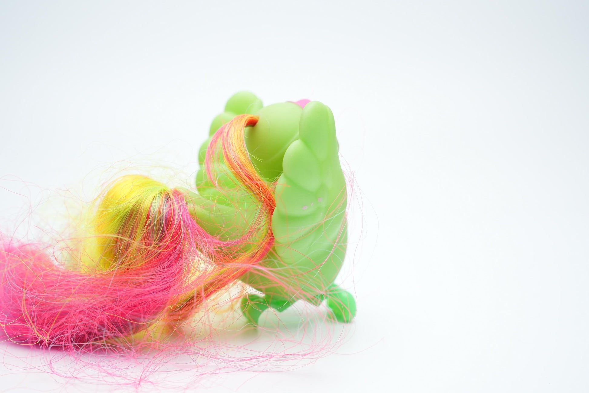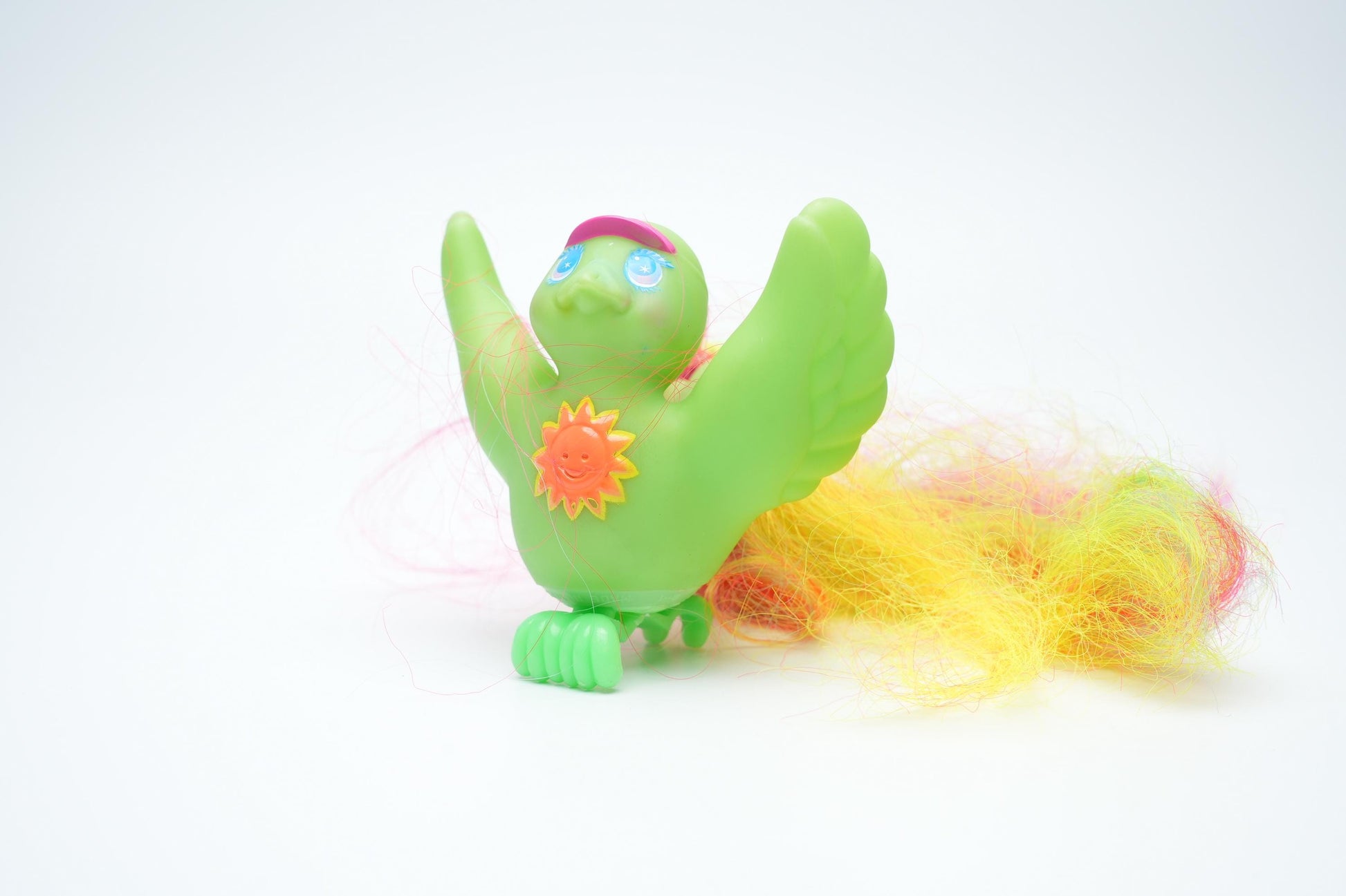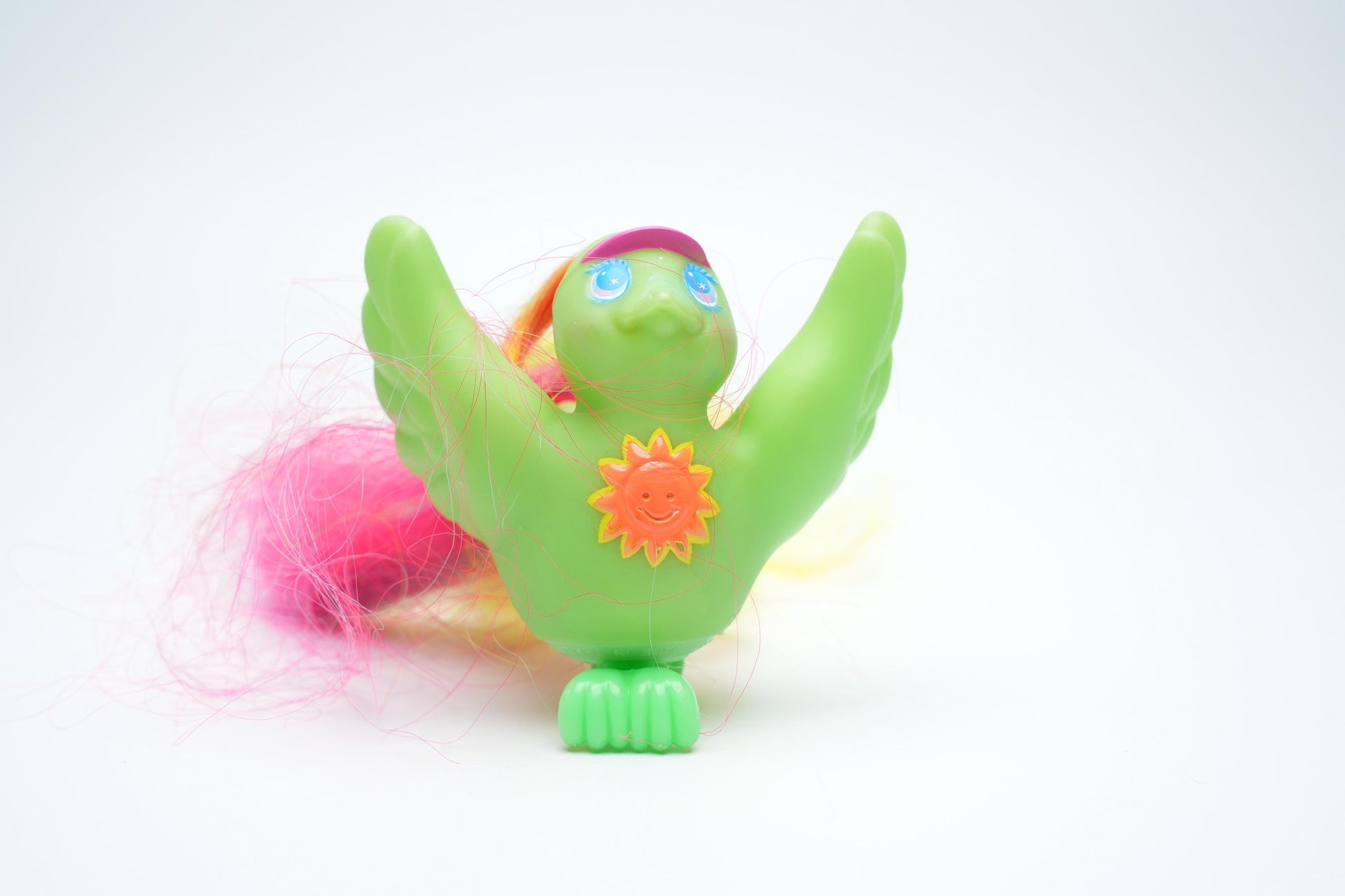 Beleef de nostalgie met deze charmante 'Fairy Tail Bird' uit de jaren 1986-1987 van Hasbro. Deze prachtige vogel is uitgevoerd in een levendig groen met neonroze en gele veren, die elk kinderhart sneller doen kloppen.