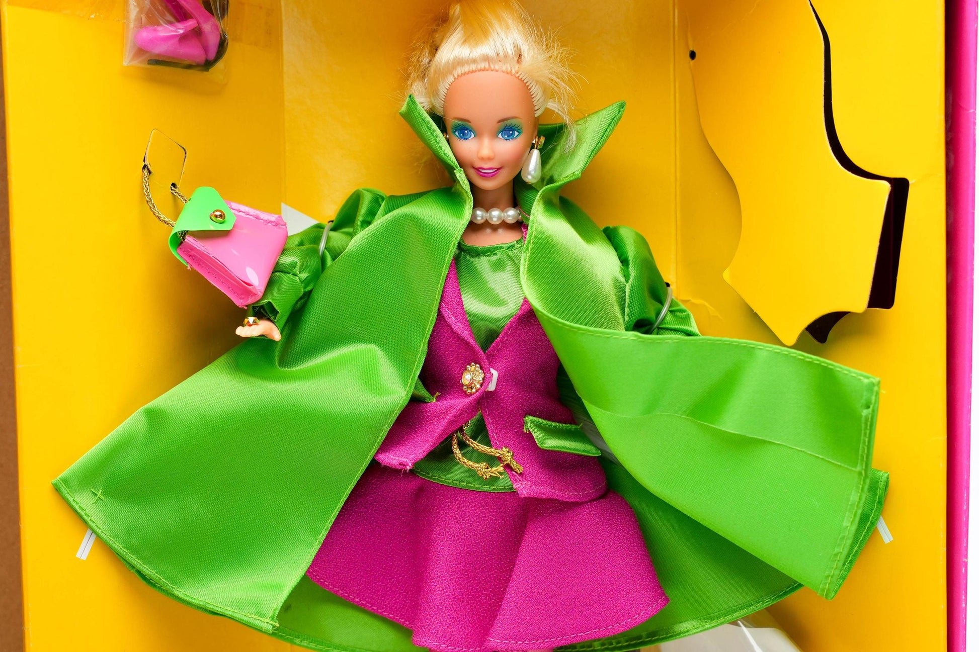 Stap in de wereld van high-fashion met de Limited Edition Barbie Madison Avenue FAO Schwarz (1995)! Deze zeldzame Barbie, speciaal ontworpen voor de iconische speelgoedwinkel FAO Schwarz, belichaamt pure elegantie met haar chique outfit in felle kleuren. De combinatie van een felgroene satijnen jas en een magenta power suit maakt haar een echte blikvanger in elke verzameling.