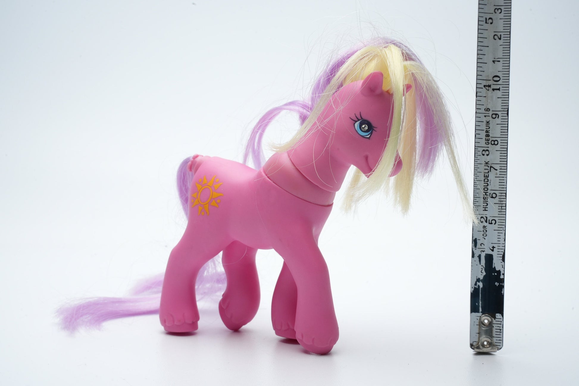 Deze schattige My Little Pony is op zoek naar een nieuw huisje! Met haar roze vacht en paars en blond haar is dit vintage paard een must-have voor elke verzamelaar of fan.