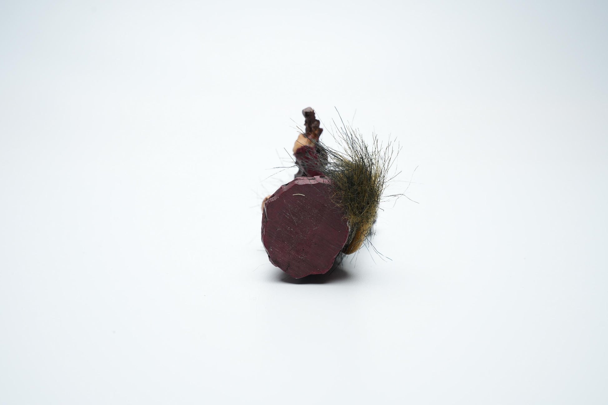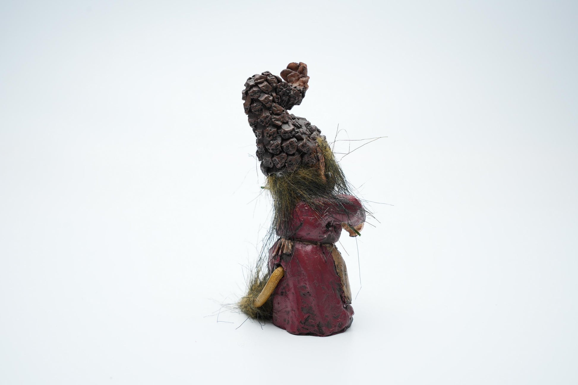 - Unieke hoed van dennenappelschubben, wat een rustieke charme toevoegt