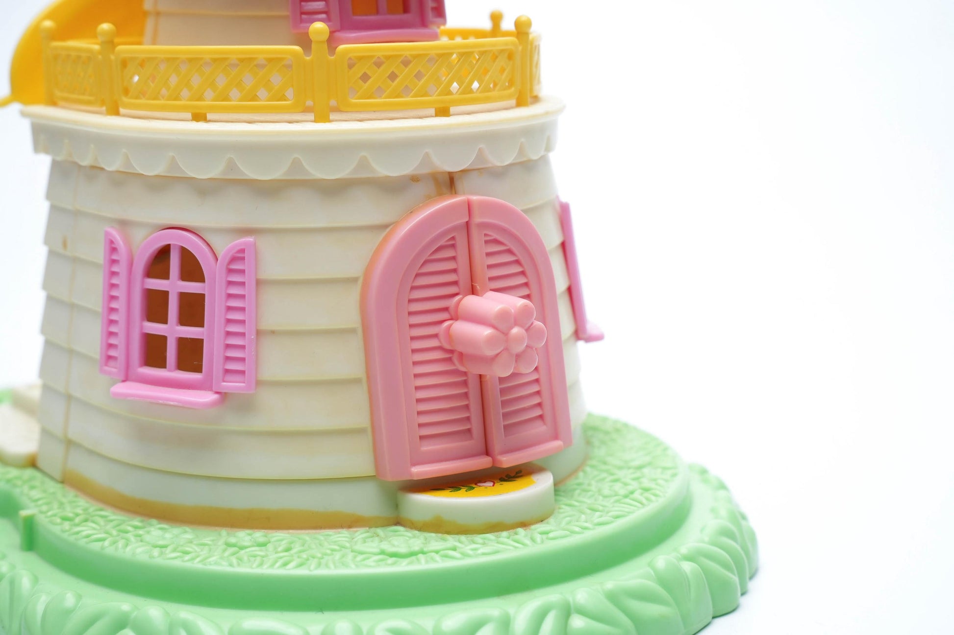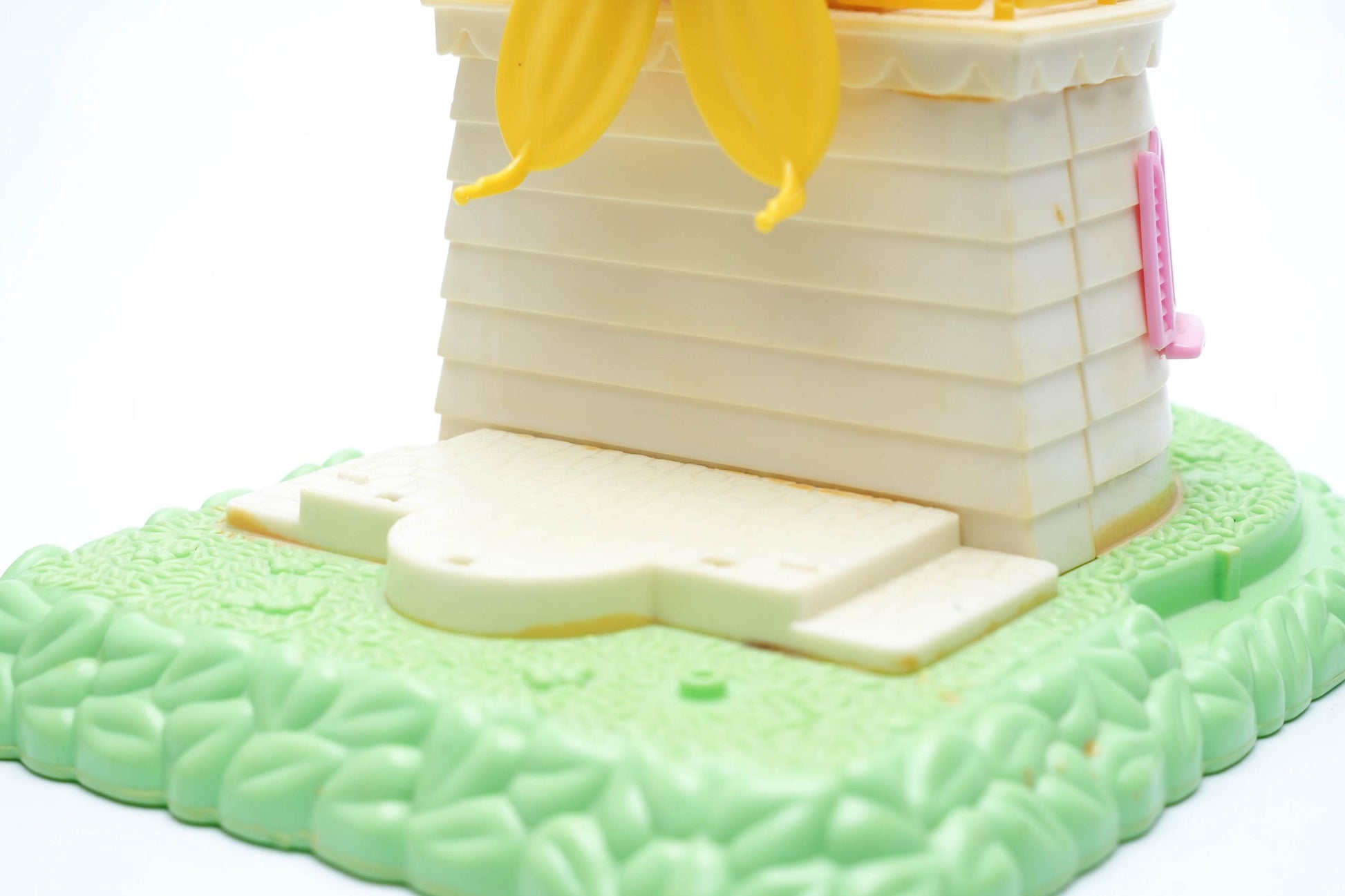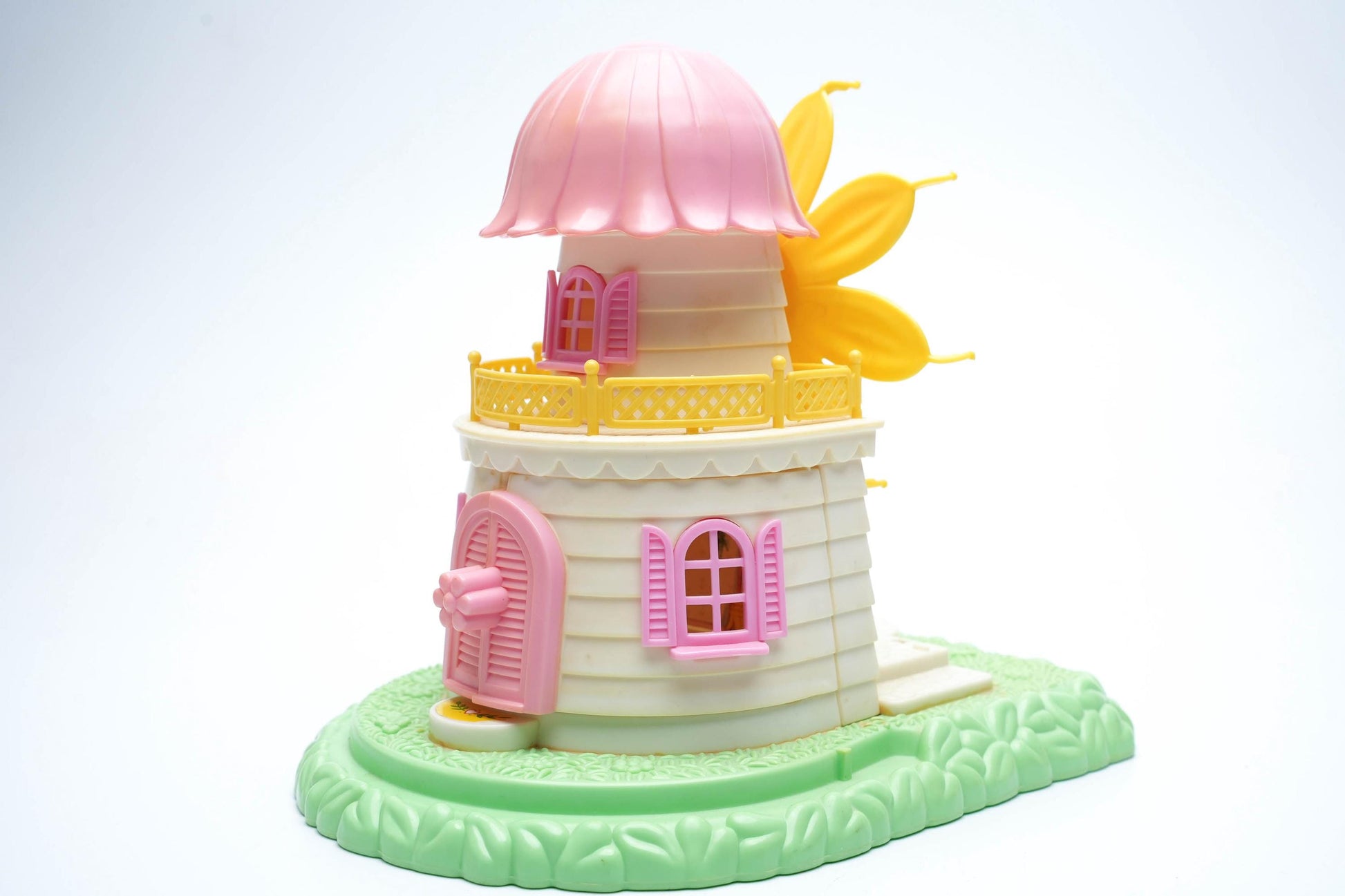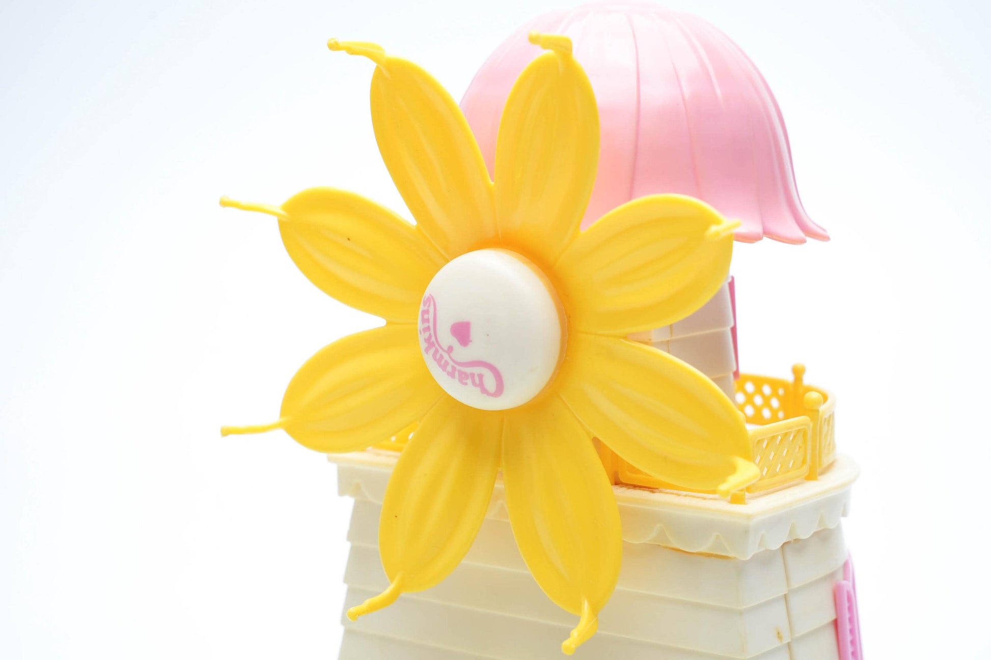 Laat je betoveren door de charme van de Vintage Charmkins Whippoorwill Flower Mill van Hasbro, een iconische speelset uit 1983 die een wereld van fantasie en plezier biedt. Deze prachtige molen, met zijn heldere kleuren en schattige details, is perfect voor verzamelaars en liefhebbers van retro speelgoed. De vrolijke zonnebloemrad en het pastelroze dak creëren een sfeervolle achtergrond voor jouw miniatuurfiguurtjes.