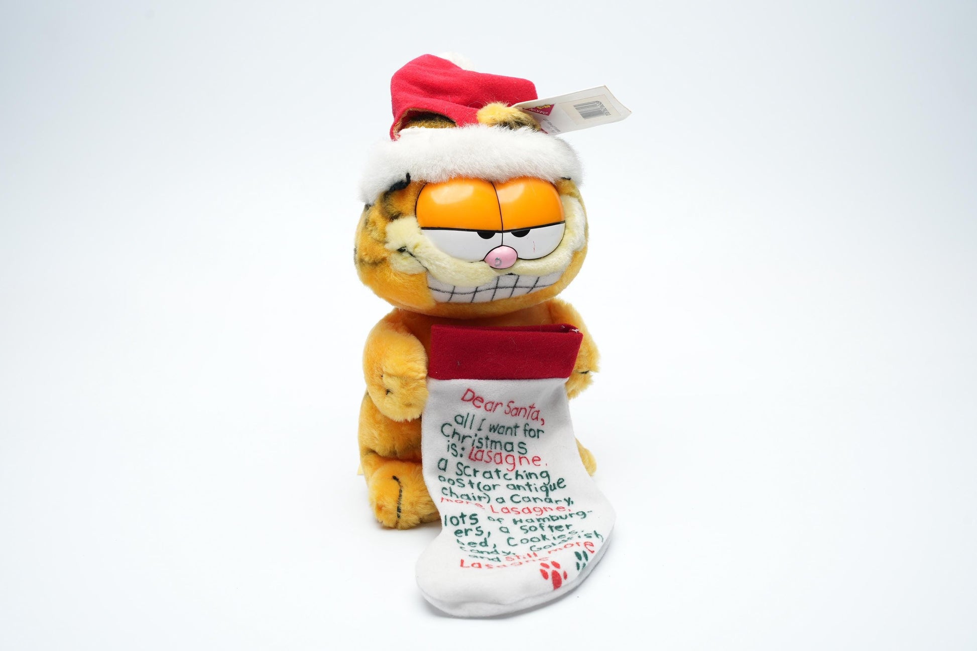 Vier de feestdagen met een vleugje nostalgie met deze Vintage Garfield Kerstman Knuffel met Kerstsok. Deze 25 cm (10 inch) hoge knuffel is niet alleen een charmante aanvulling op je kerstdecoratie, maar ook een iconisch verzamelobject uit 1981 van United Feature Syndicate. Met zijn ondeugende lach en grappige tekst op de kerstsok, brengt deze Garfield knuffel de herkenbare humor in je huis tijdens de feestdagen.