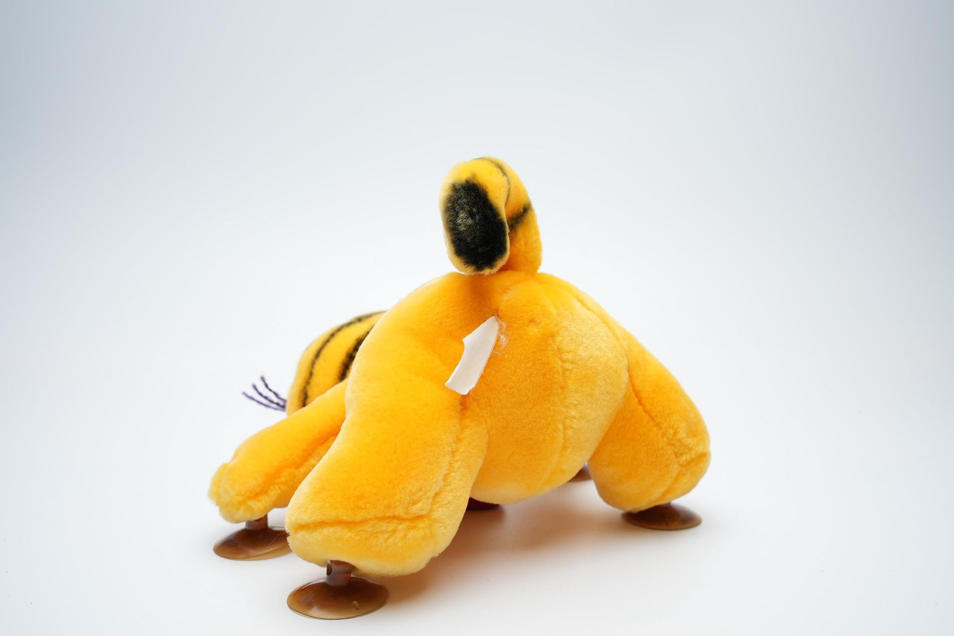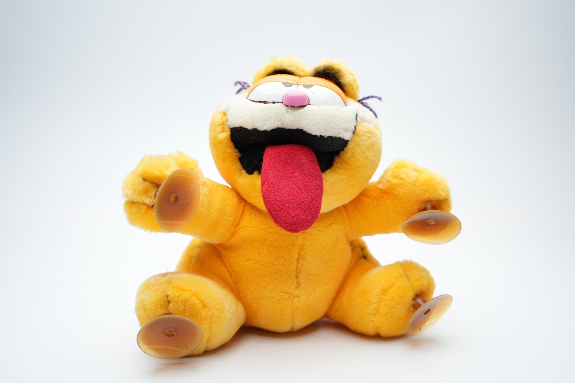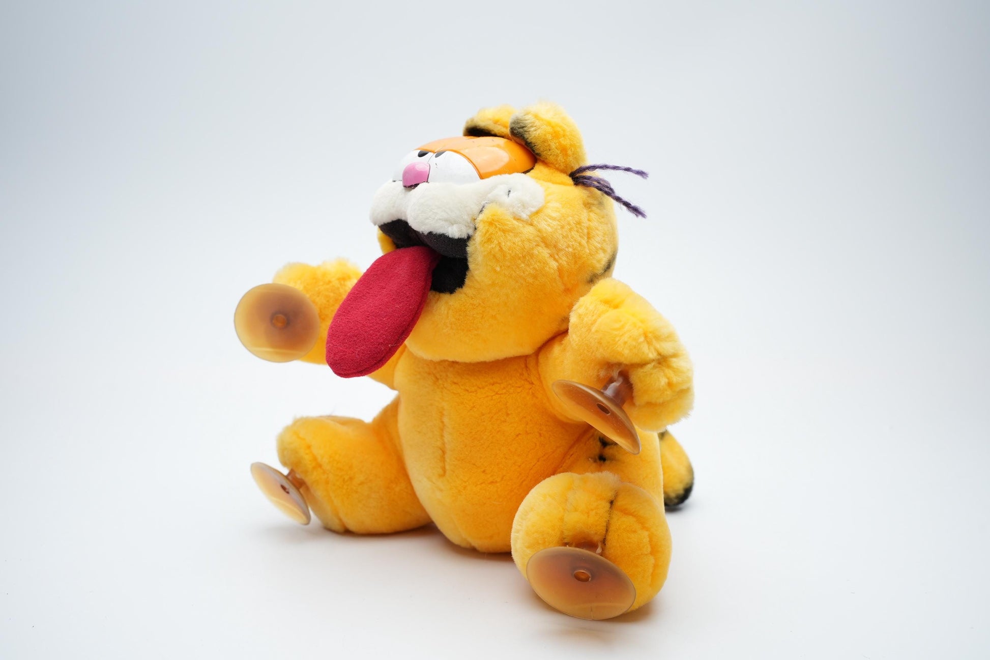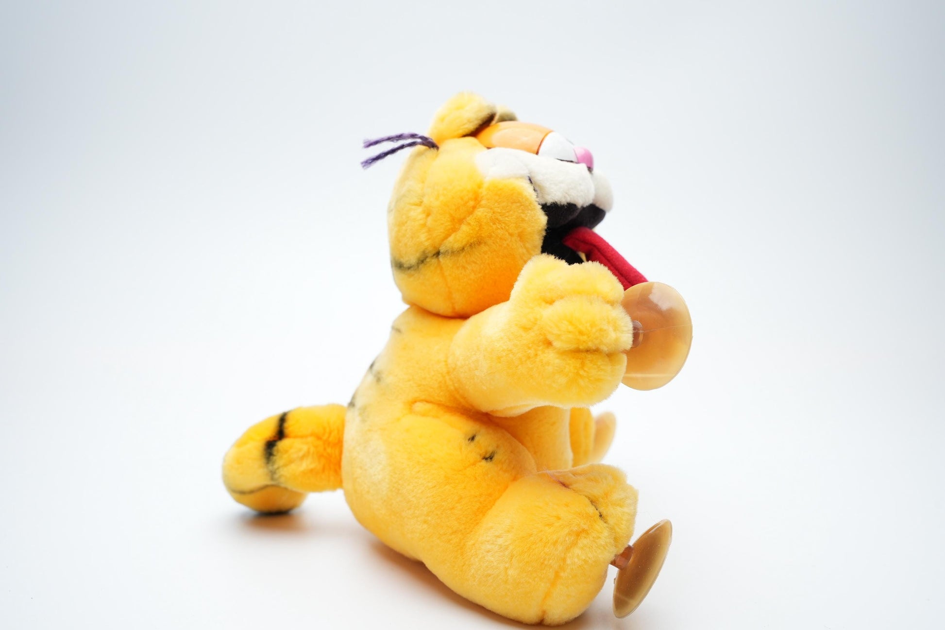 Maak kennis met de Vintage Garfield Knuffel met Zuignappen van United Feature Syndicate Inc. & Paws uit 1981! Dit originele stuk is niet alleen een knuffel, maar ook een glimlachbrenger met zijn speelse uitstraling en iconische retrocharme. Met zijn grote tong en praktische zuignappen is deze pluchen kat een perfect accessoire om elk raam of glad oppervlak op te vrolijken!