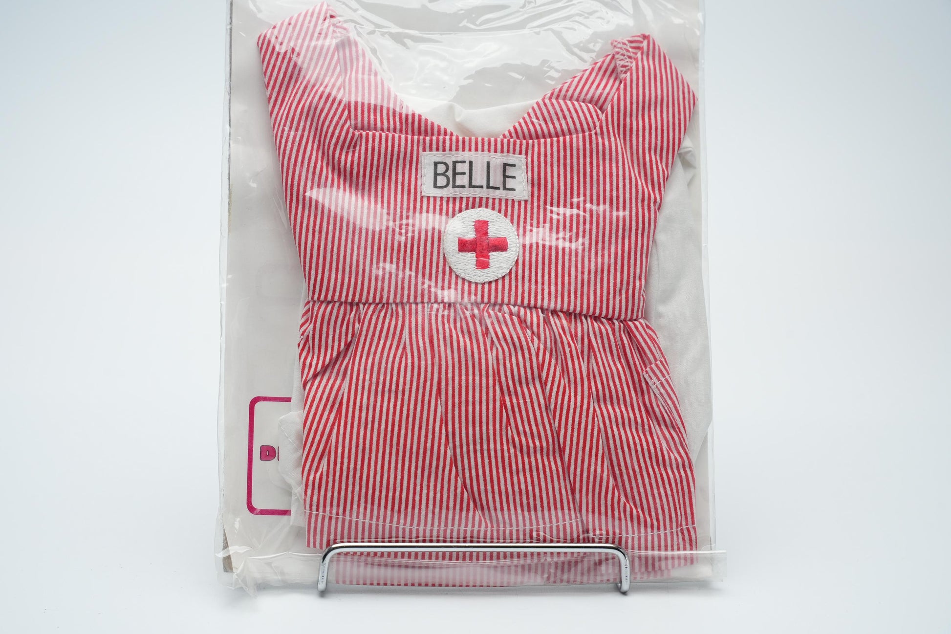 - Stijl: Verpleegstersoutfit met vintage rode strepen en een elegant Belle-embleem.