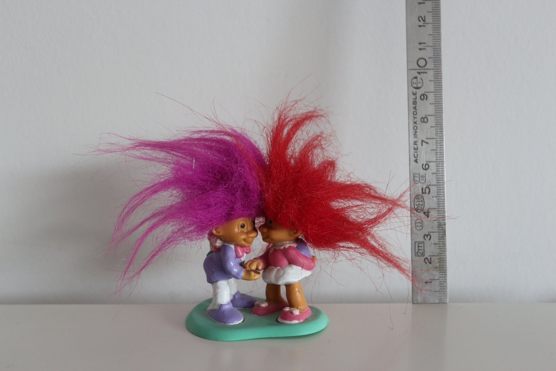 Laat deze Vintage Trollen figuurtjes paars en rood haar (stel) niet aan je voorbijgaan! Met hun unieke vintage charme zijn ze perfect voor iedere verzamelaar of als een opvallende decoratie in je huis. Bestel vandaag nog en voeg een vleugje vintage magie toe aan je leven!